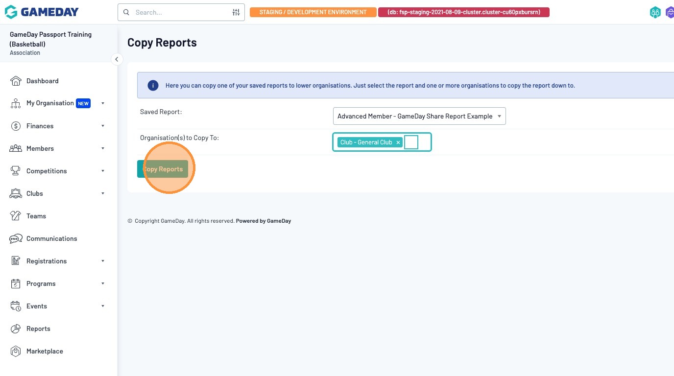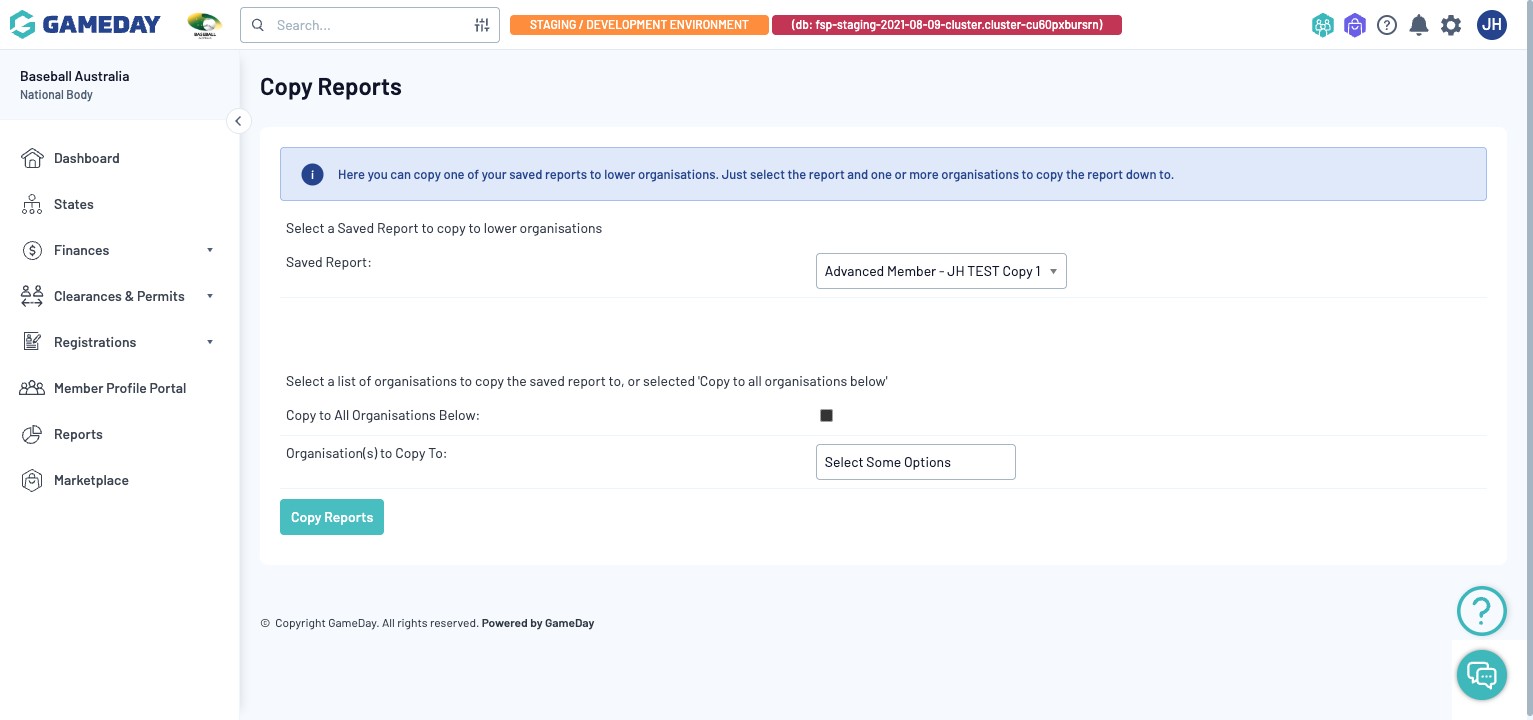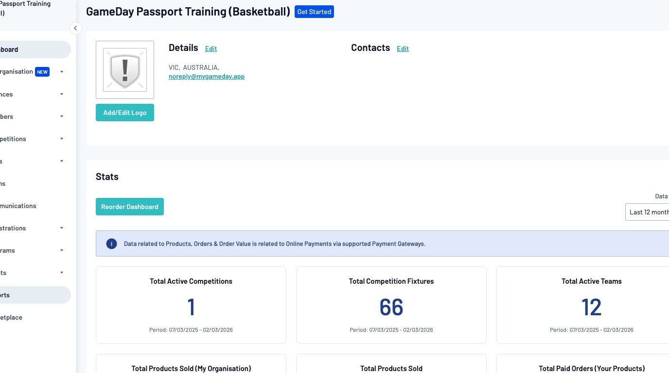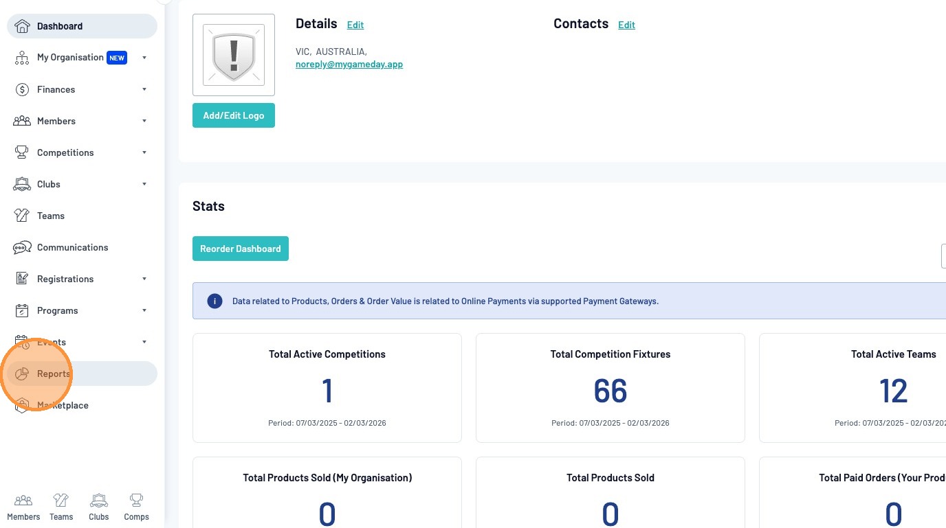 GameDay enables administrators to create customised reports and share them with organisations sitting below them in the hierarchy (for example, State → Region → Association → Club).