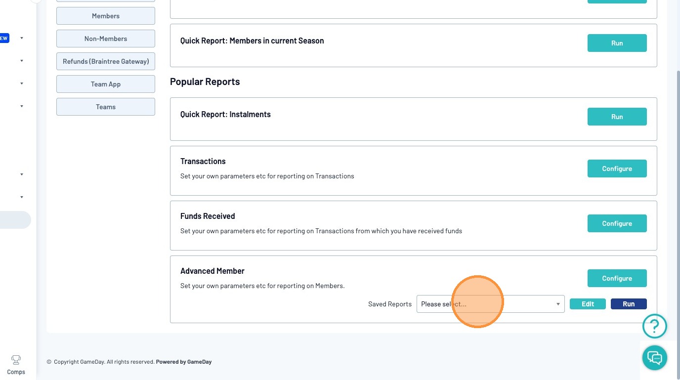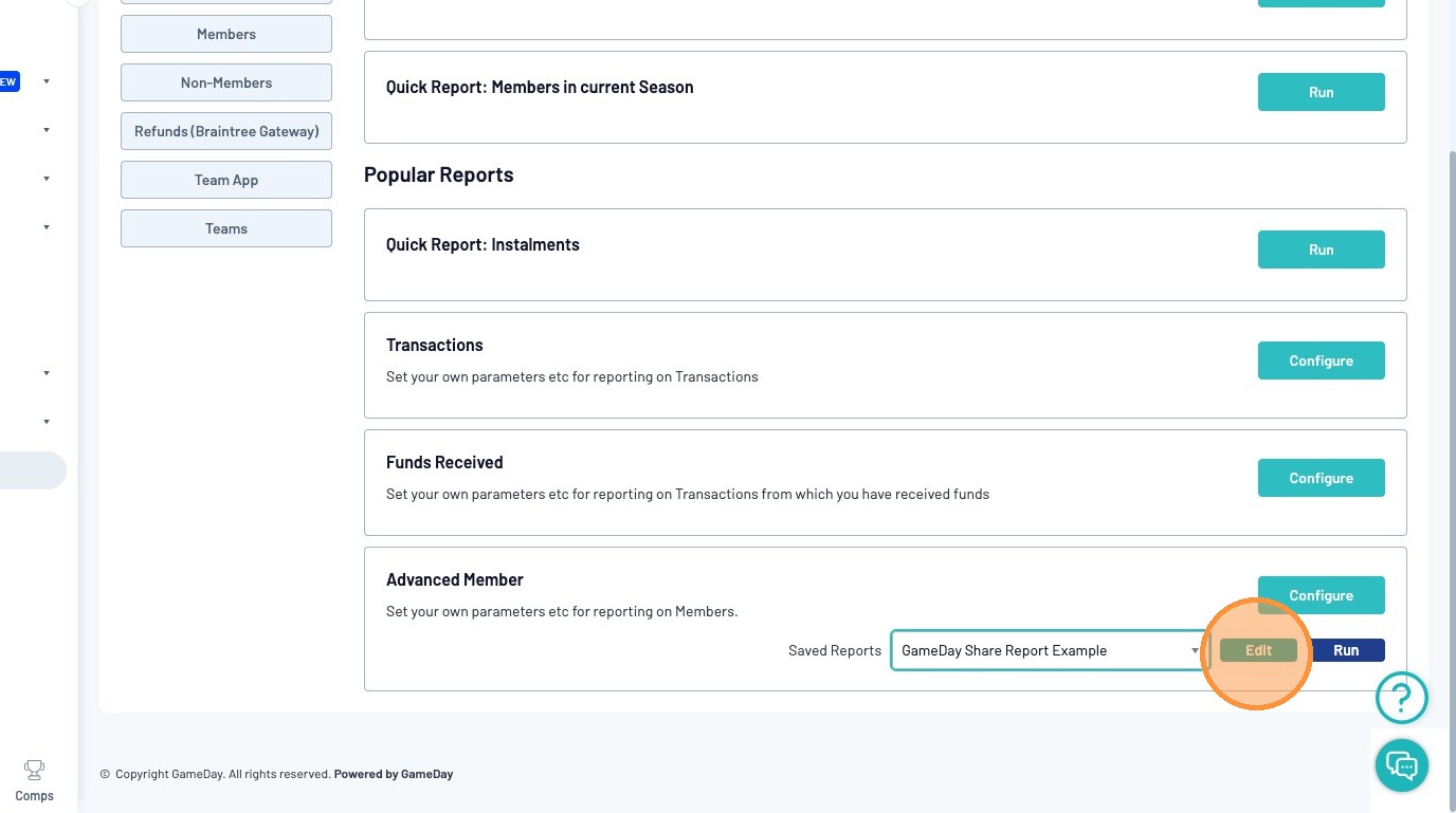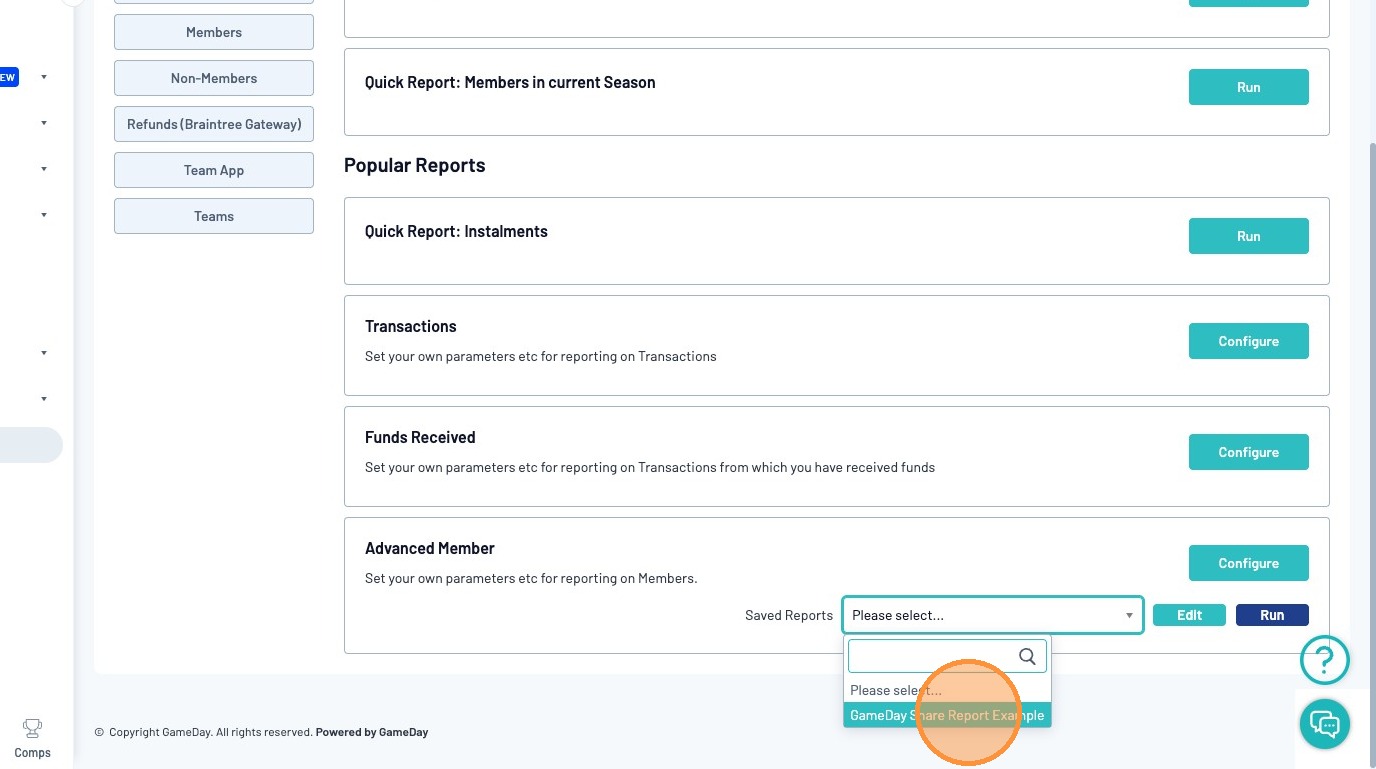 Click on the Saved Reports dropdown and select "GameDay Share Report Example"