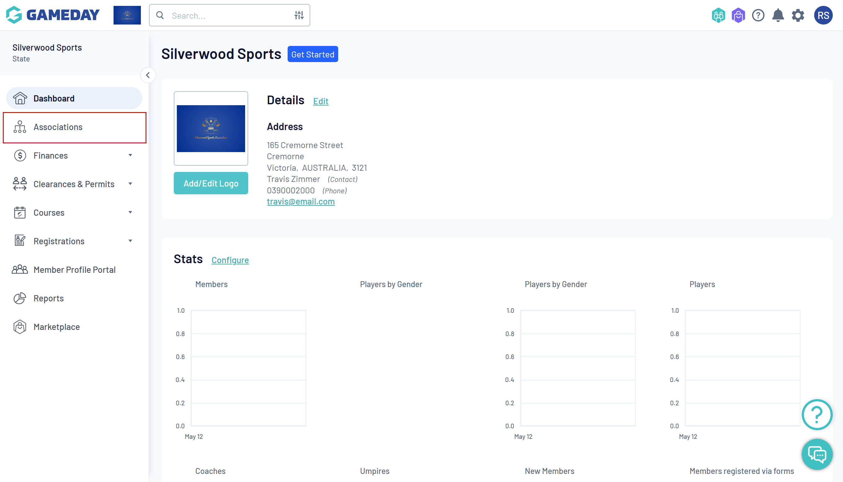 You will now be on the dashboard for that organisation. You can continue to drill down the hierarchy by repeating the process. For example, from the Association dashboard, select Clubs > LIST CLUBS then select a specific club from the list.