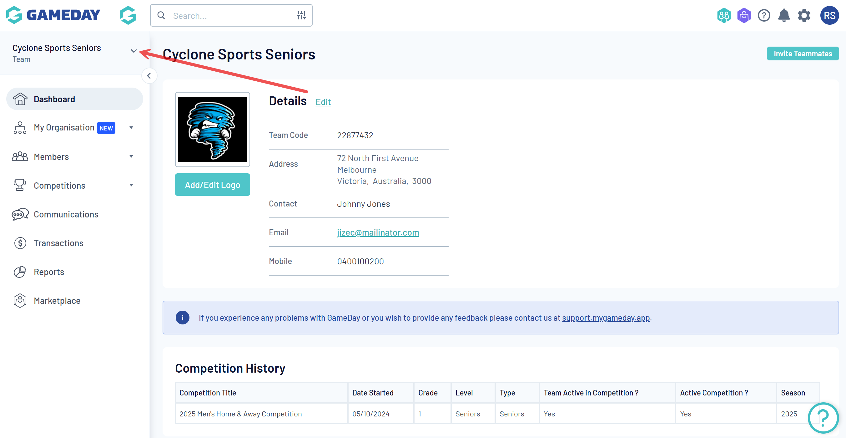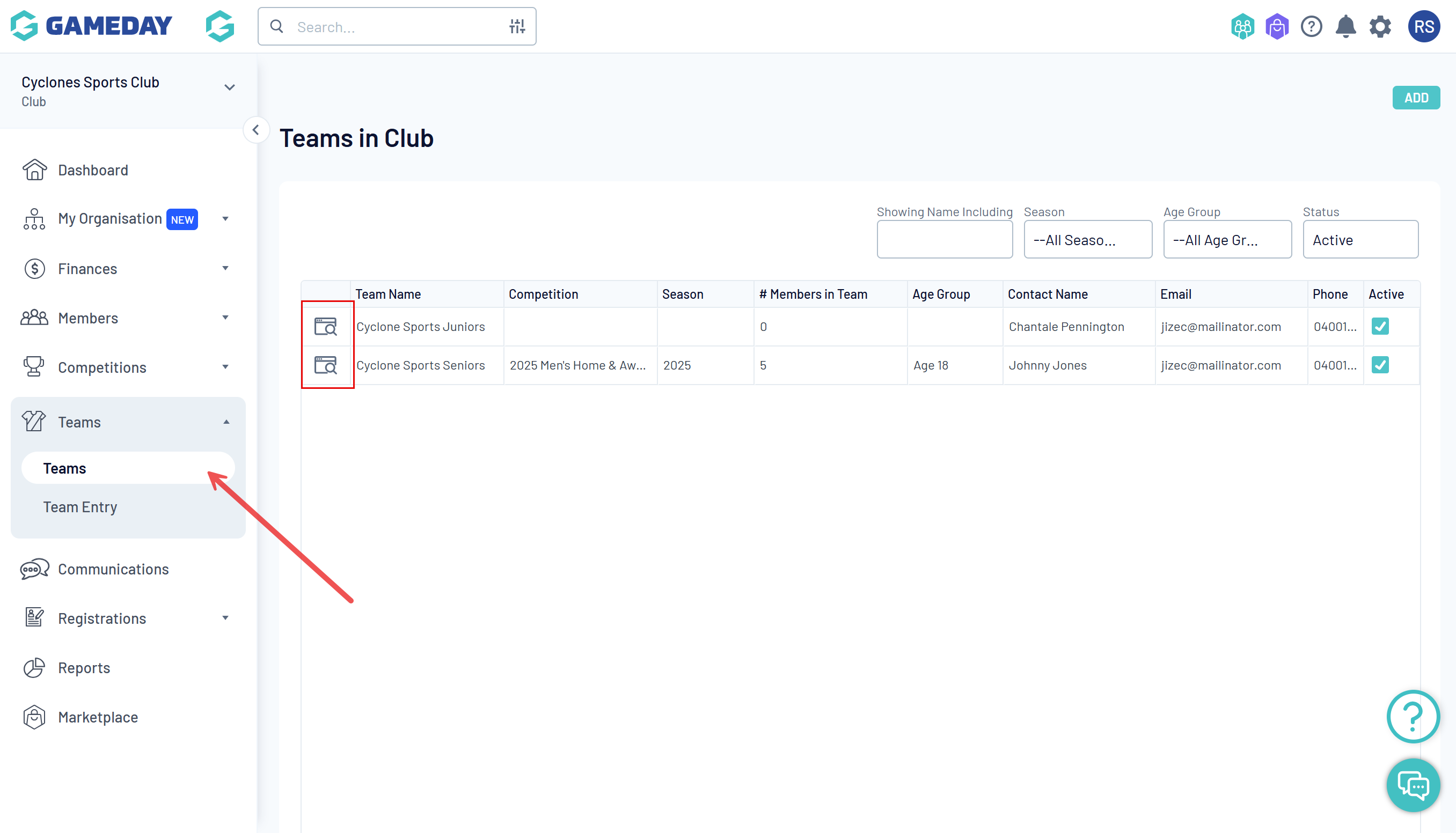 From the Club dashboard, you can then navigate to the Teams menu and select a specific team to manage.