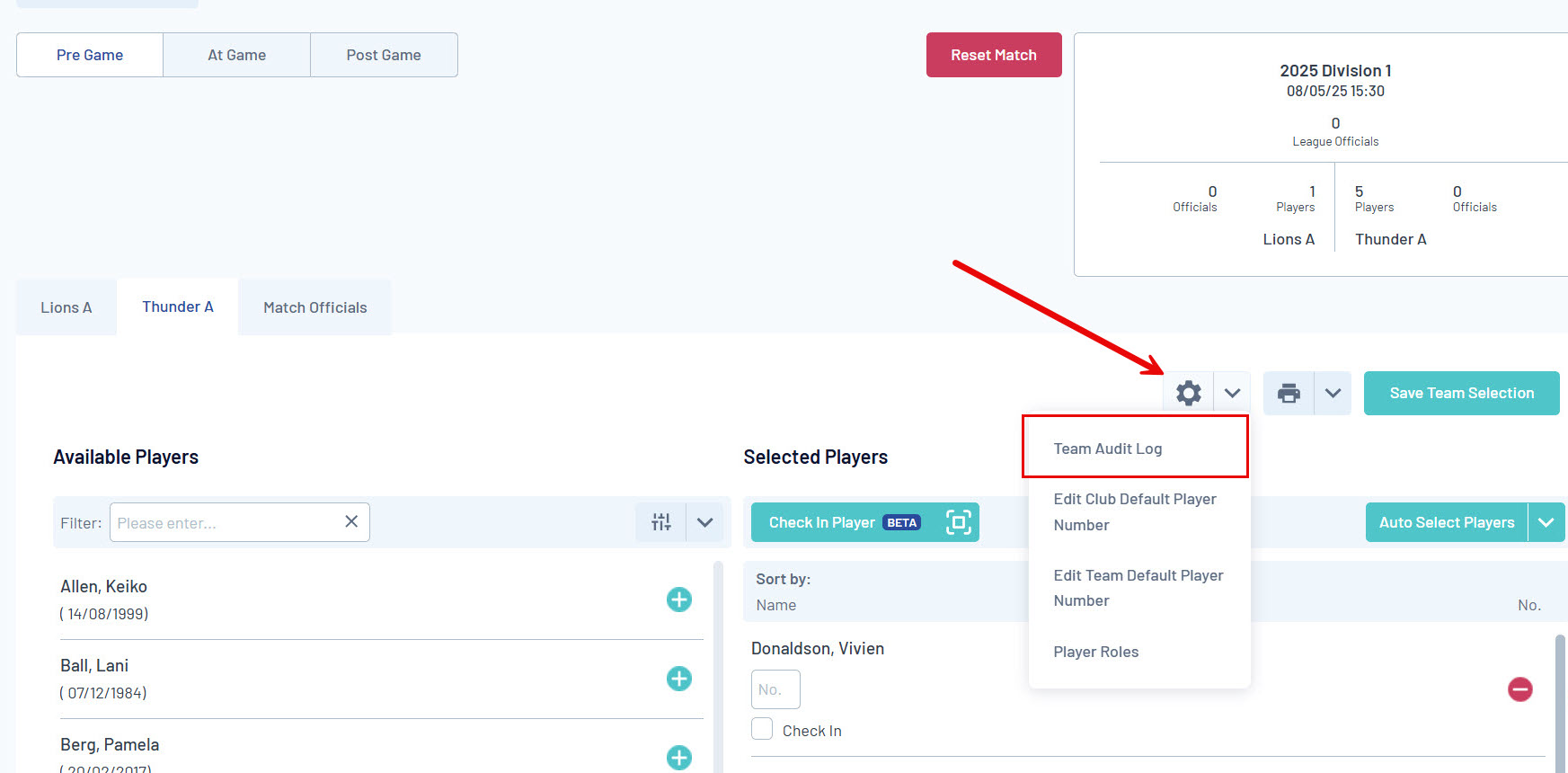 On the Pre Game screen, ensure the correct team tab is selected, then click the Settings Cog icon located above the 'Selected Players' list, and click TEAM AUDIT LOG from the menu that appears.