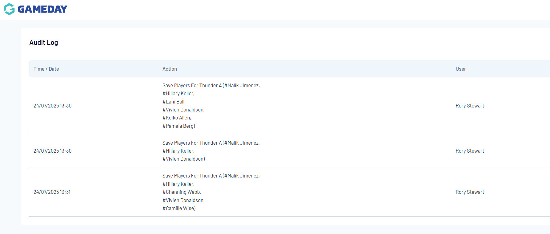 You will be taken to the Team Audit Log page. This screen displays a table containing the date of an action, a description of the action (e.g. players saved to a team), and the user who performed it.