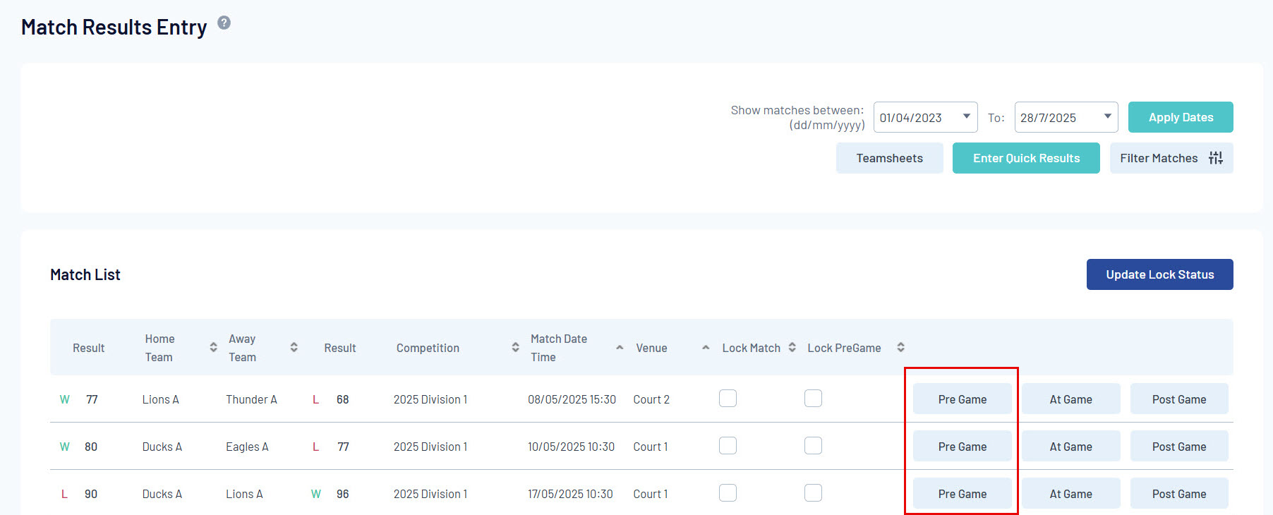 From the Match List, find the match you wish to review and click the PRE GAME option