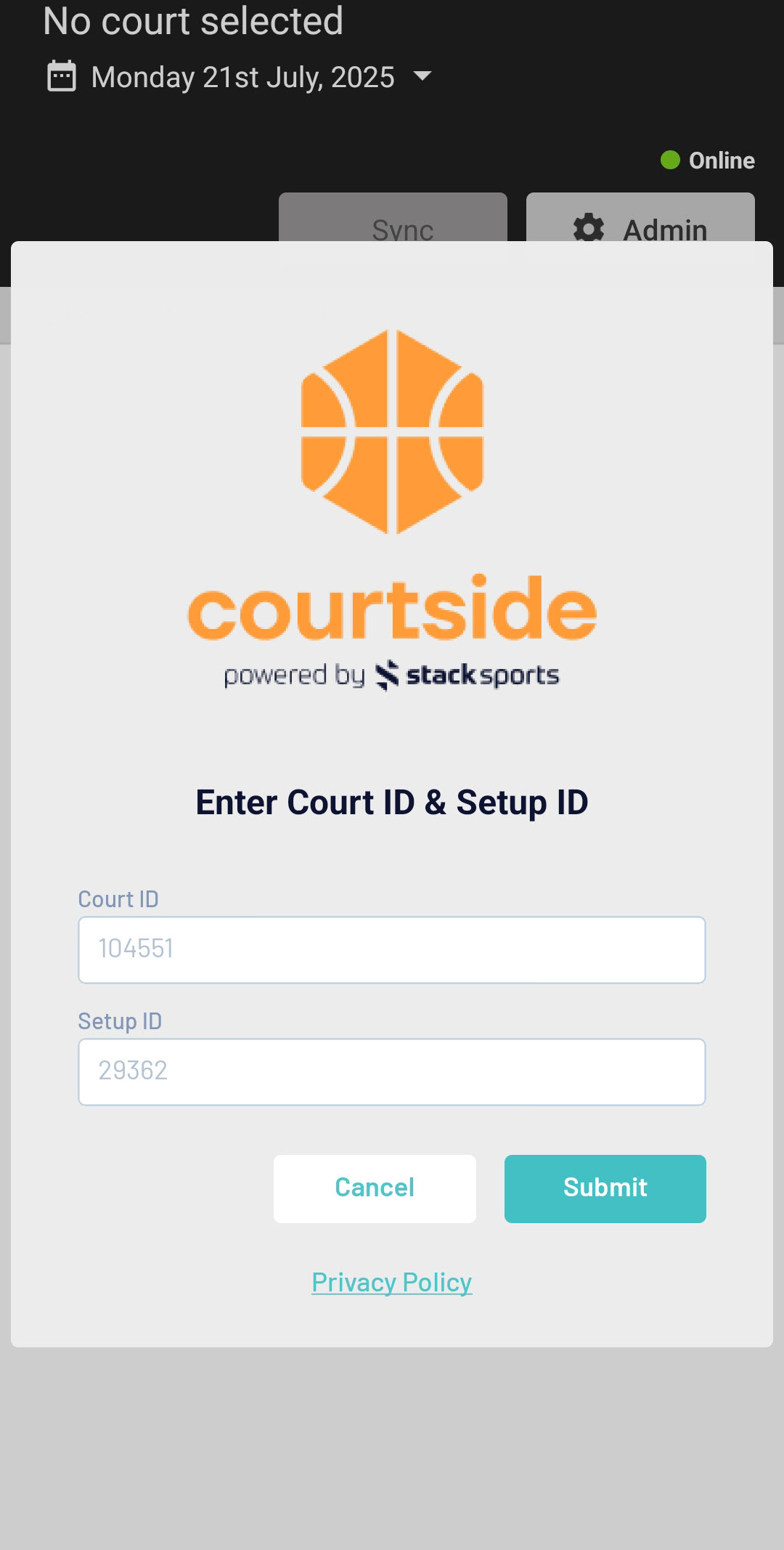 Open the Courtside App and enter your Court ID and Setup ID to login