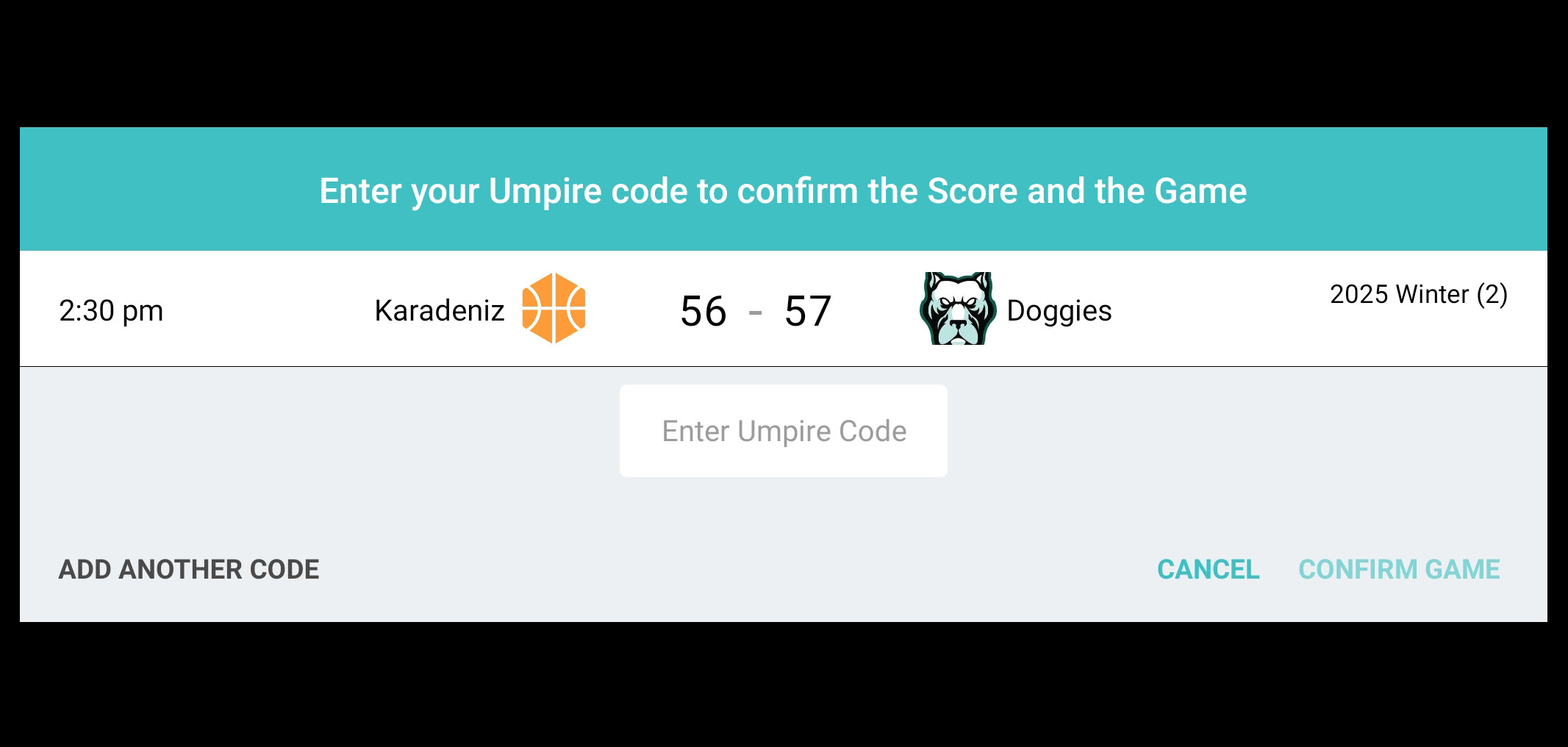 Enter your Umpire Code and tap CONFIRM GAME to confirm the match results and push the data into your association's Passport database. If you are unsure of your umpire code, your Association's administrator can find and send this to you following the steps here