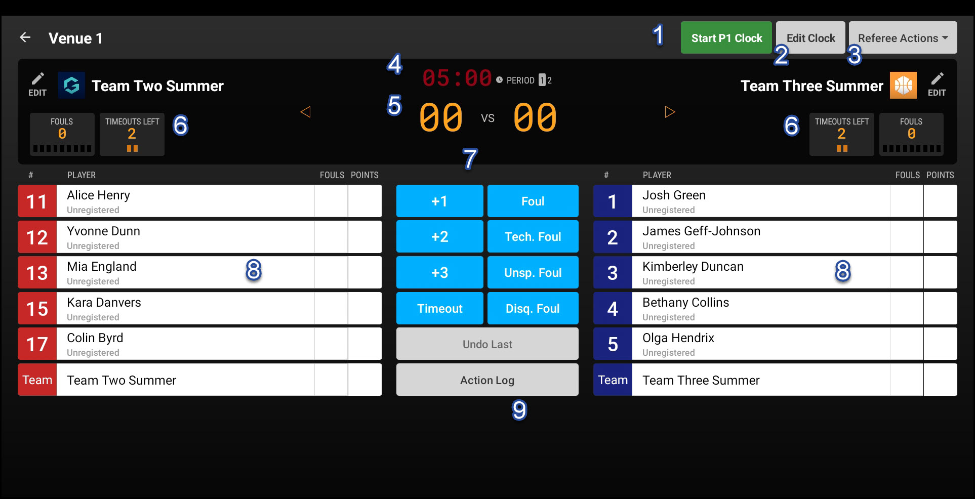 Click the Start Clock button and use the Courtside interface to add statistics to the players and teams involved.