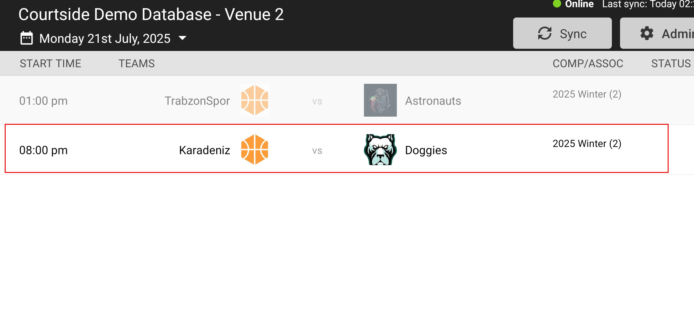 On the first screen, you will see a list of matches scheduled for today at this court.