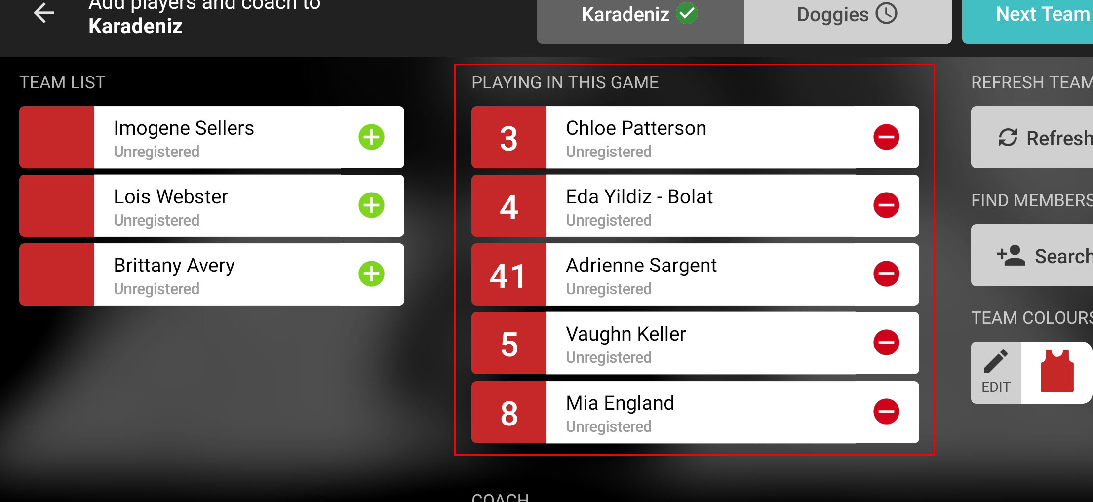 Use the + and - buttons to select the players that will be participating in the match for each team