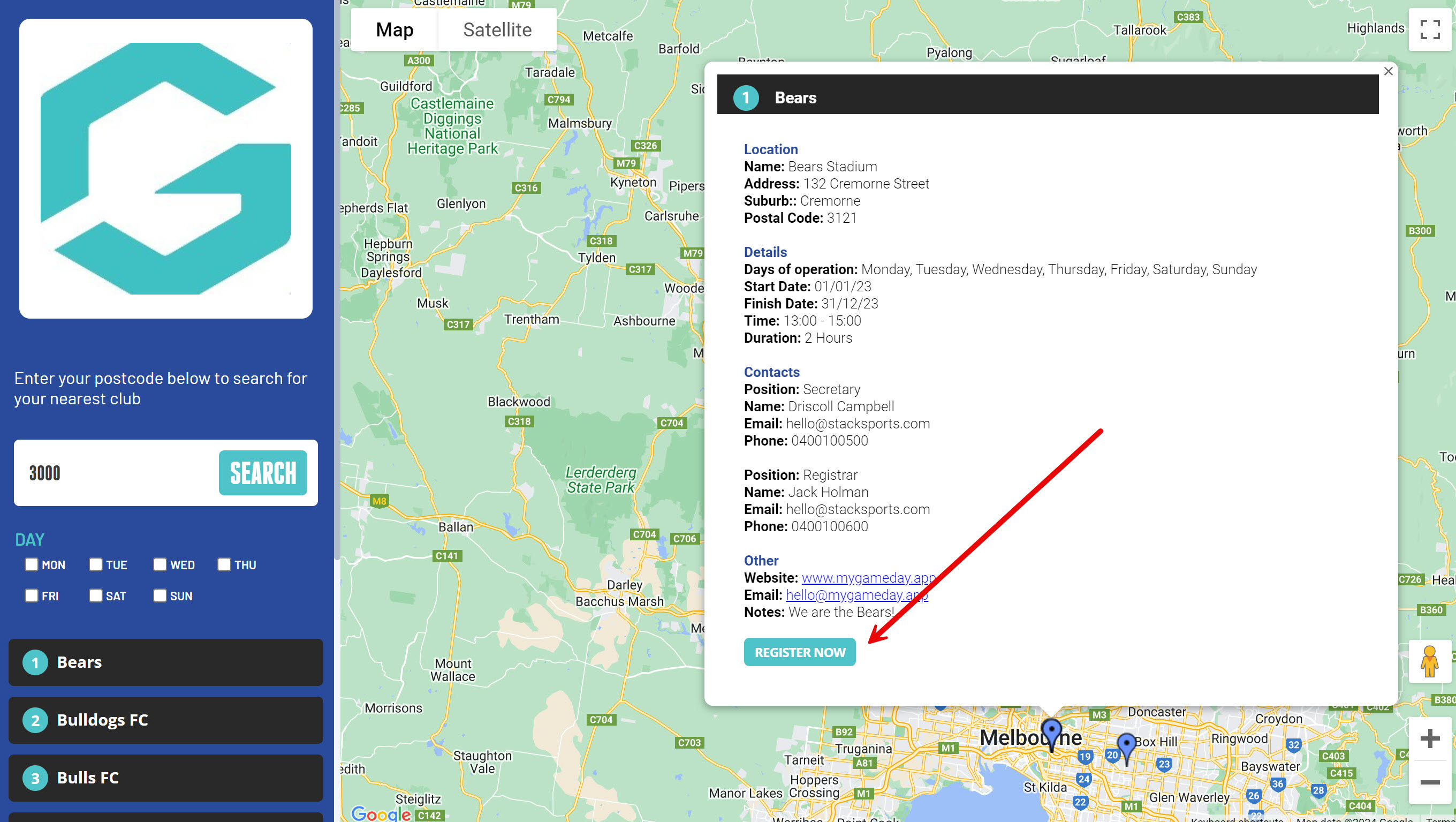With a form linked, when members of the public find your organisation through your sport's Locator, they will be able to register through the assigned registration form by clicking the REGISTER NOW button: