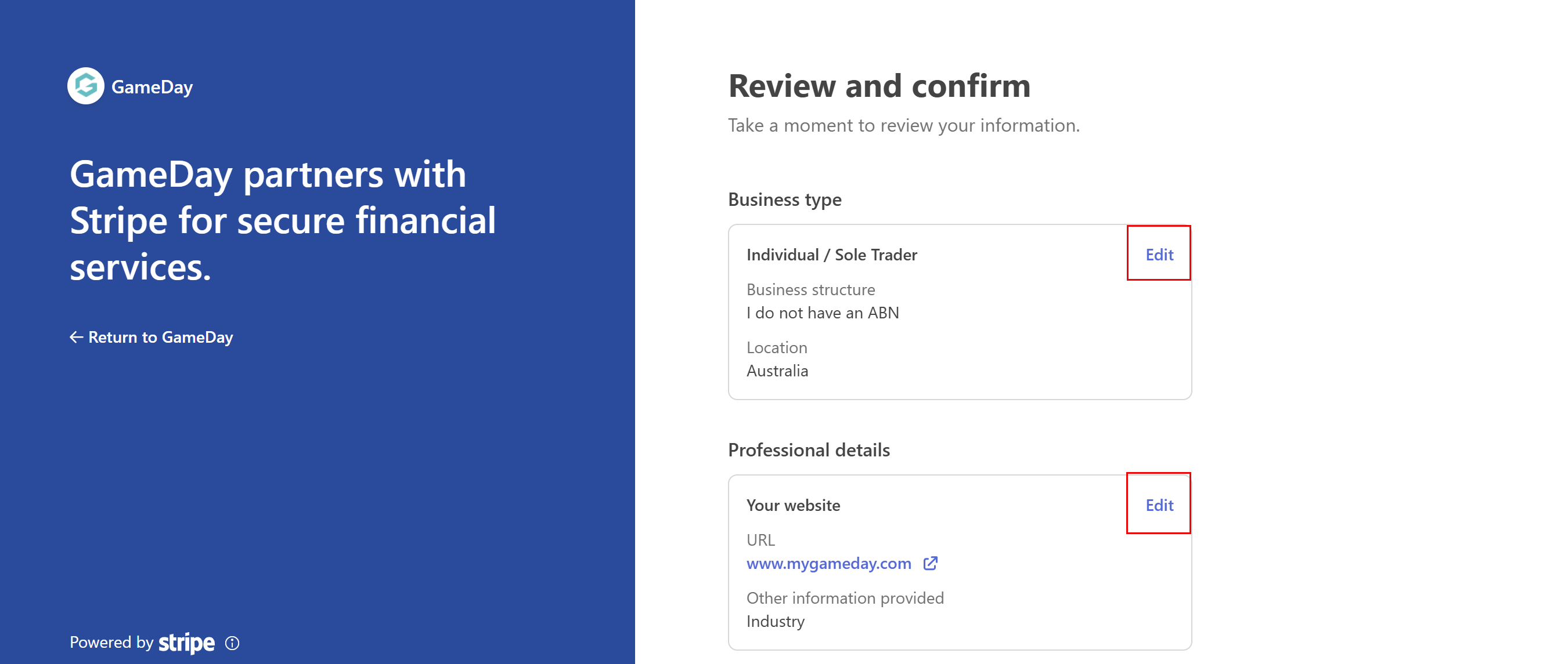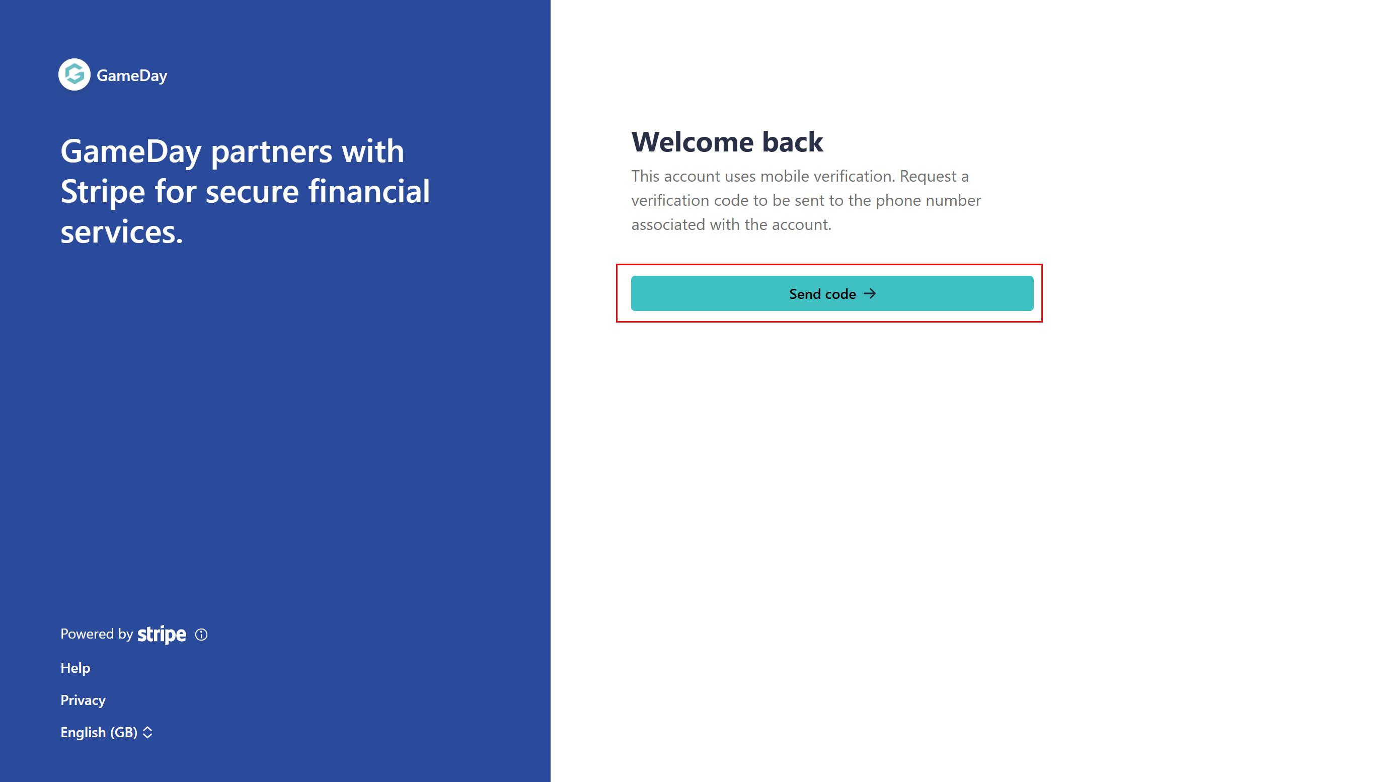 For security, Stripe uses a mobile verification process to verify that the user responsible for accessing and modifying your organisation's Stripe account details is consistent with the original account creator. Should you need to update the verification mobile number on file for your organisation, please contact the GameDay customer support team via the Contact Us link at support.mygameday.app and provide both of the following: