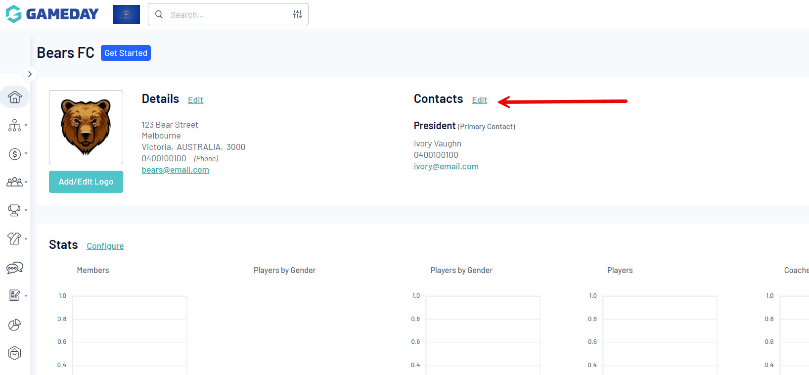 From your organisation dashboard, click EDIT next to the Contacts section.