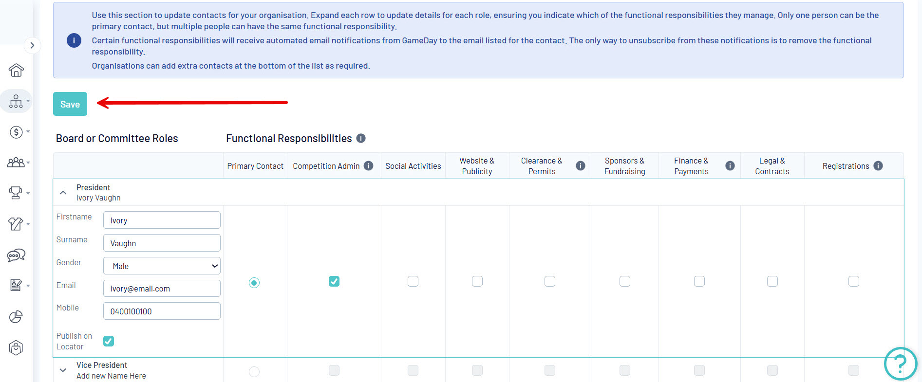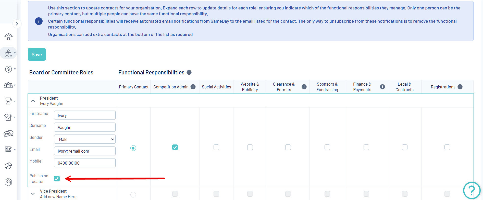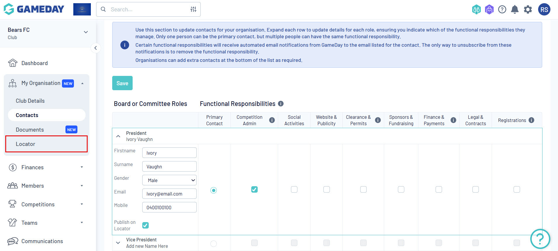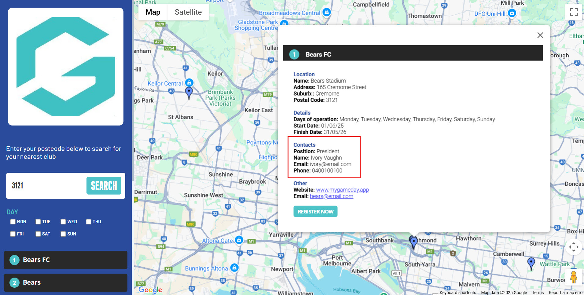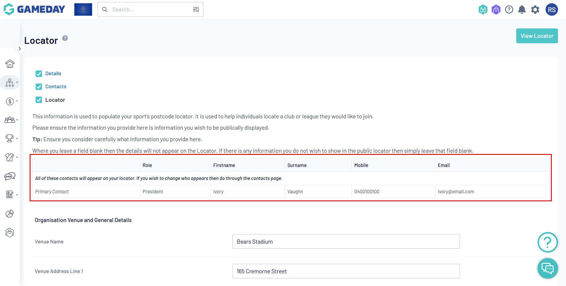 Organisations using GameDay Passport can make key contacts visible on their public locator page. This feature allows existing Organisation Contacts to be displayed along with their contact details, helping potential members easily find and connect with the right person at your club or association.