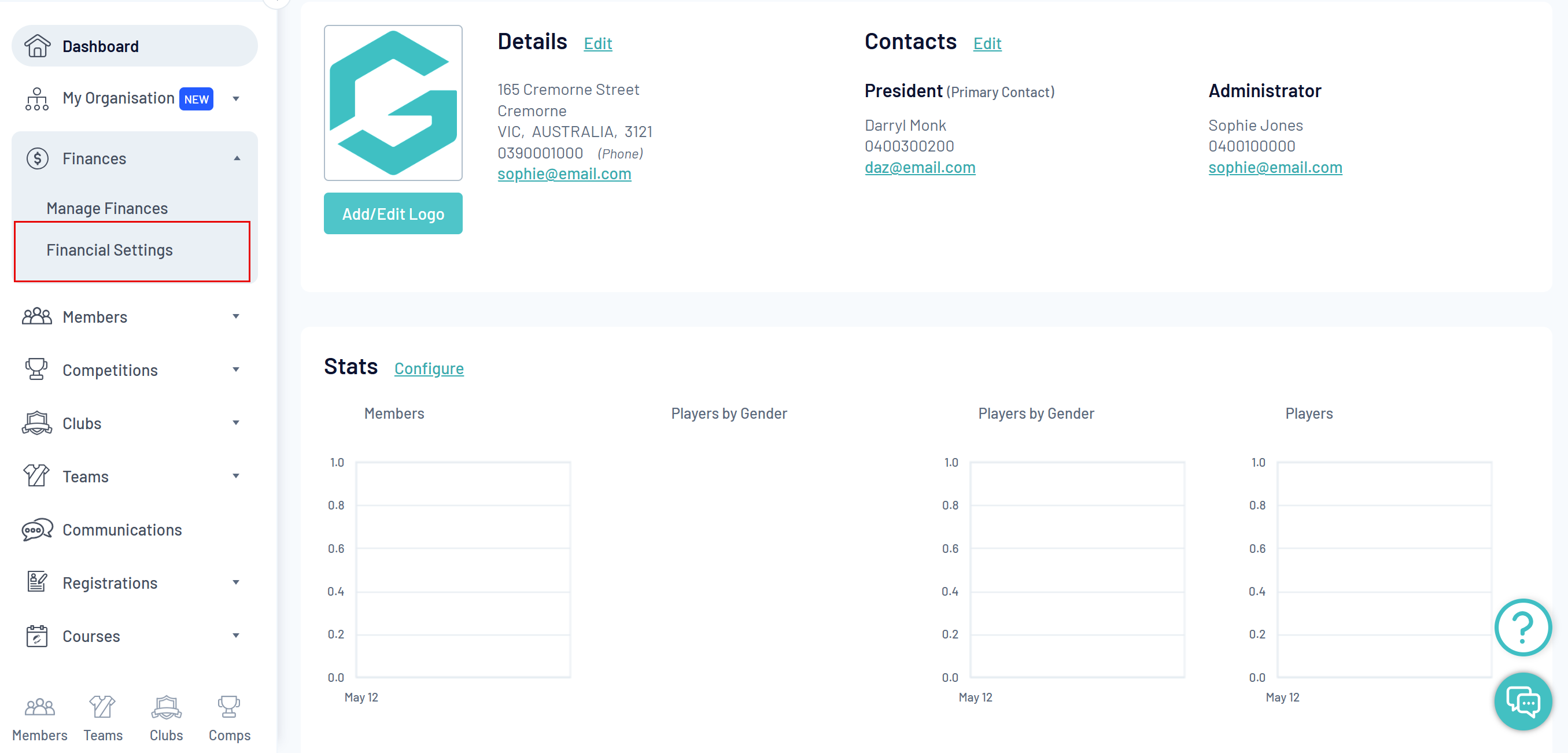 In your left-hand menu, open the Finances menu, then click FINANCIAL SETTINGS