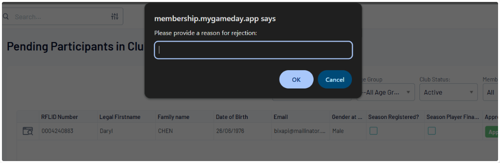 If a member is rejected, you will be prompted to enter a rejection reason, which will be included in an email notification to the member.
