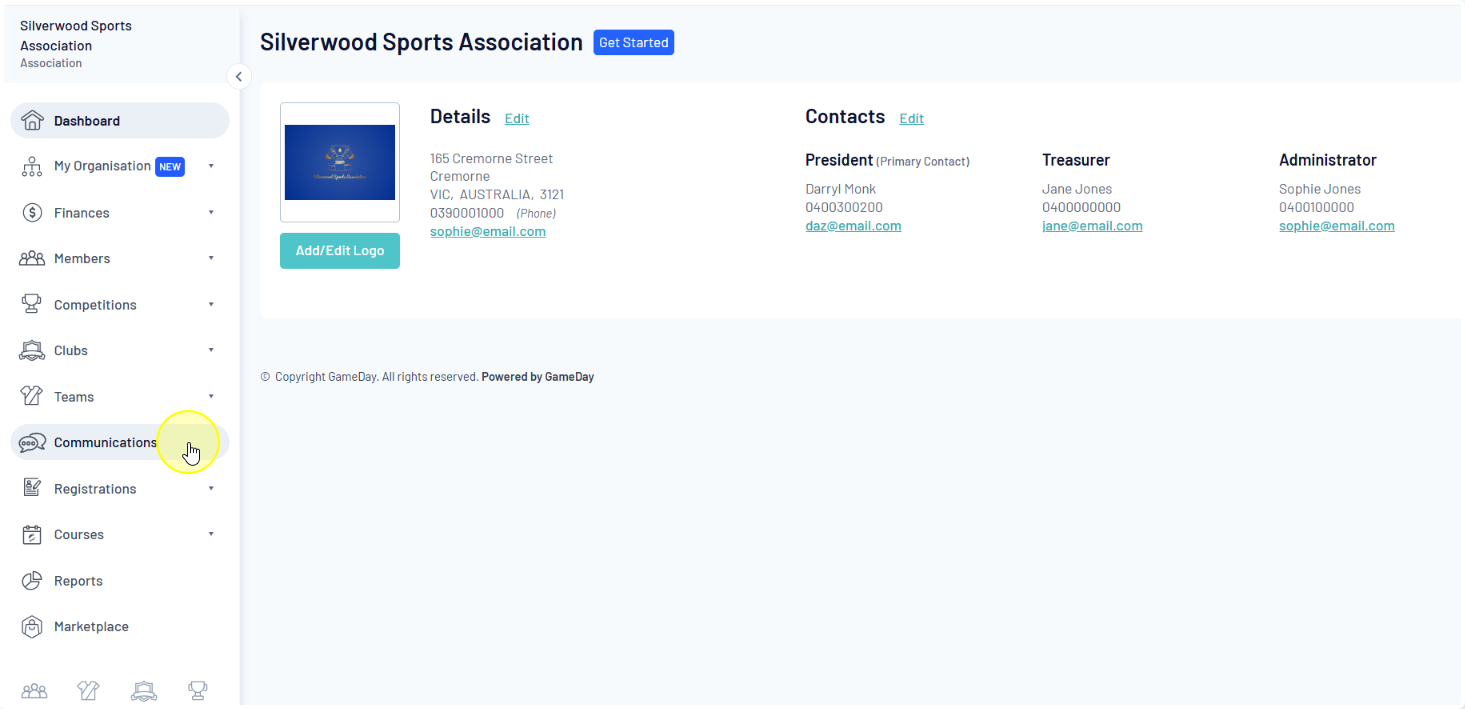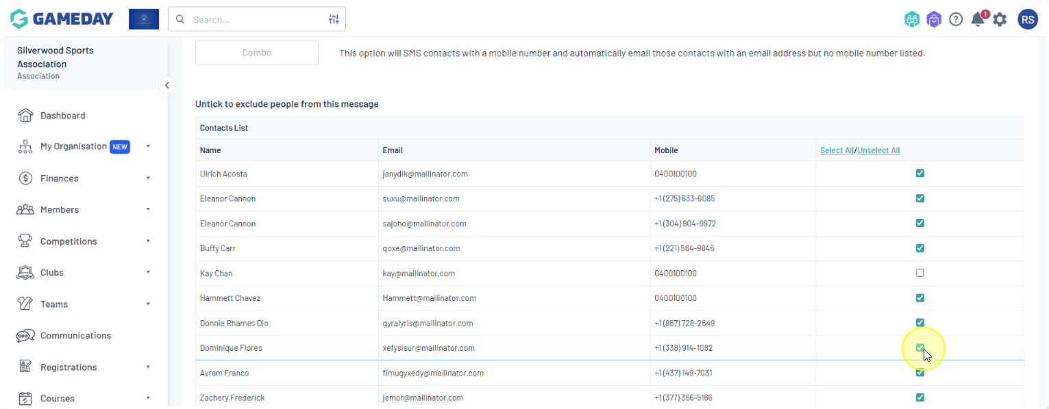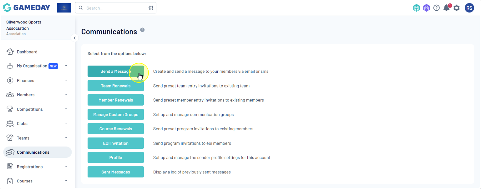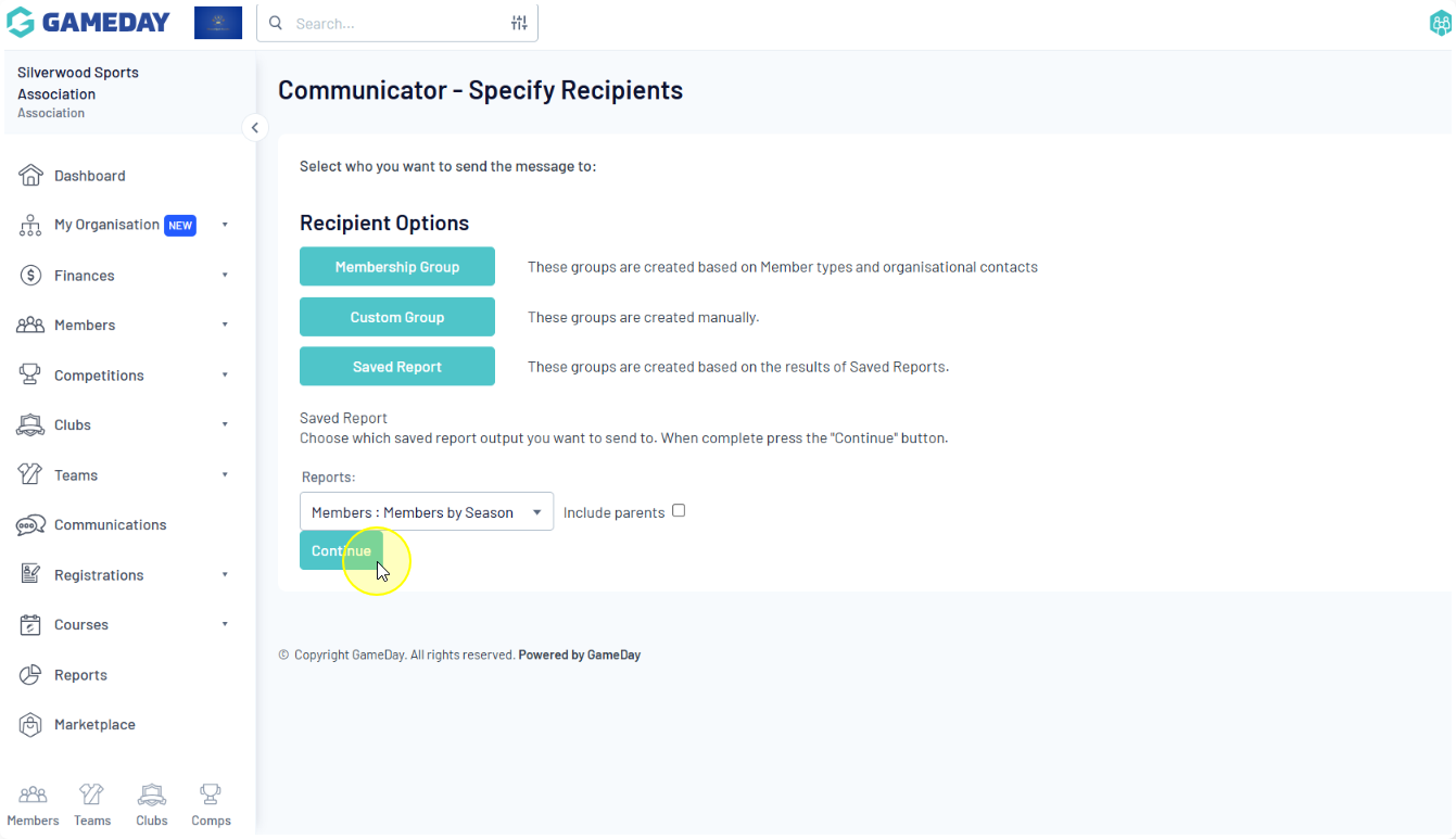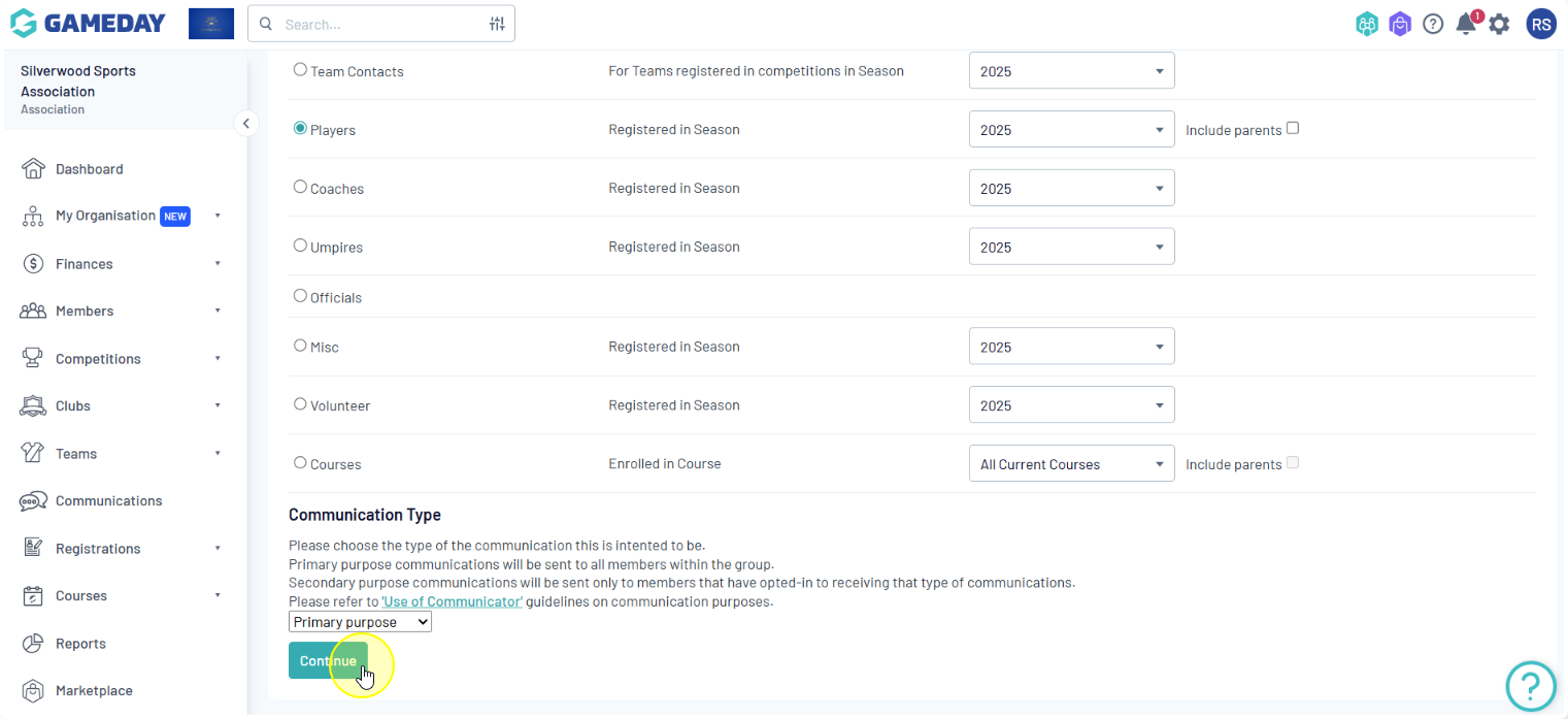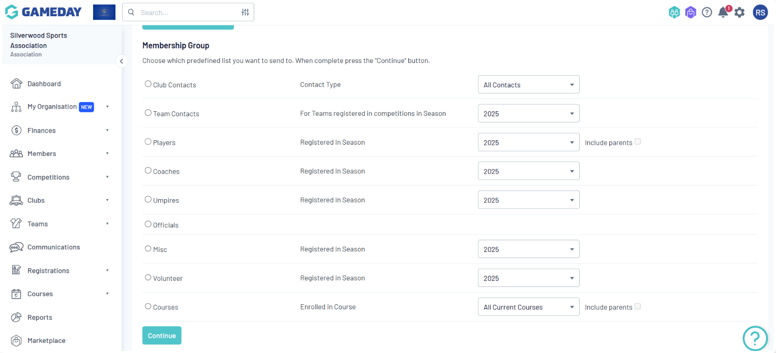 Membership Group: Select members based on their member type (players, coaches, umpires, officials), administrators from the club contacts, and/or team contacts