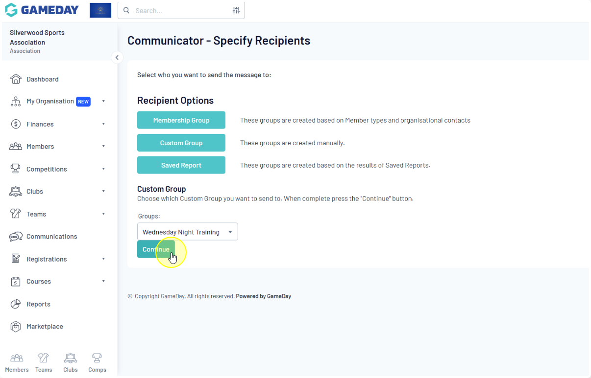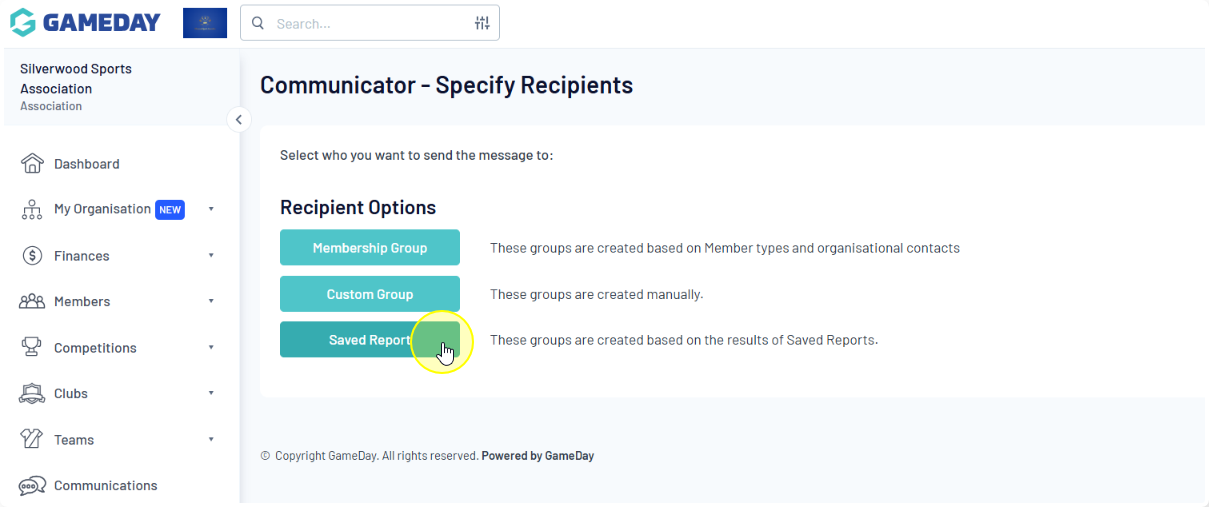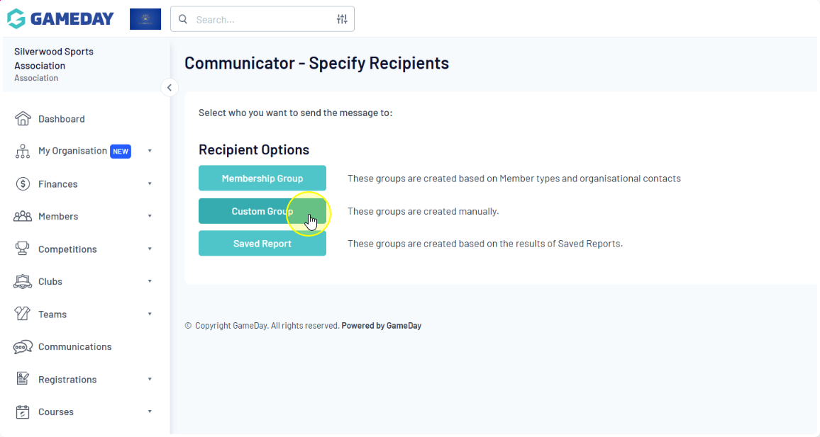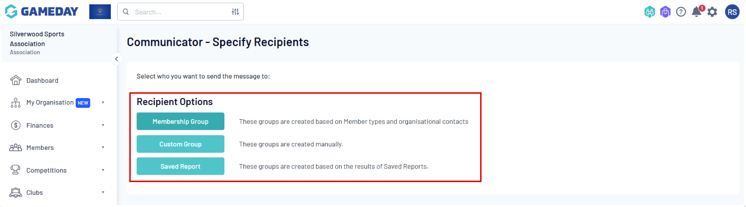 You will be prompted to select who you want to send the message to using one of the three 'Recipient Options': Membership Group, Custom Group, or Saved Report