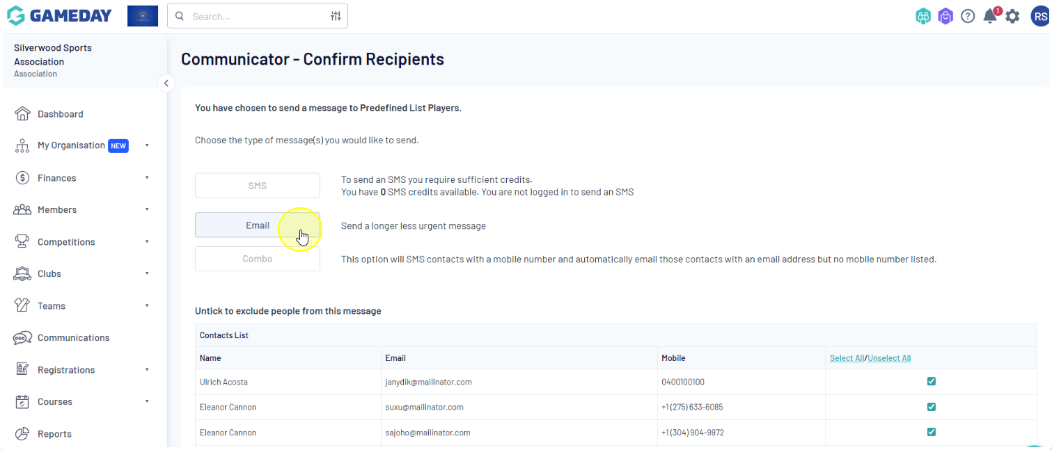 Choose the type of message you would like to send: SMS, Email, or Combo, which sends an SMS to all recipients with a mobile number and an Email to recipients with an email address but no mobile number.