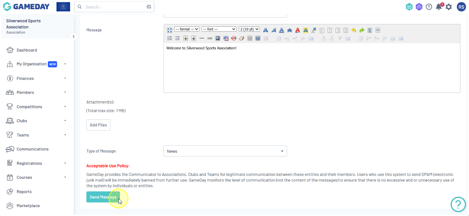 Club Contacts: Click on the Contact Type drop-down list and select the type of club contacts you want to message.