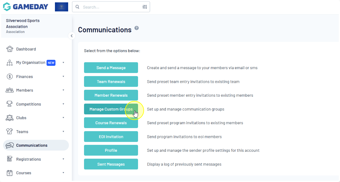 If you don't have a group listed, you can create new custom groups by selecting the MANAGE CUSTOM GROUPS option on the Communications page