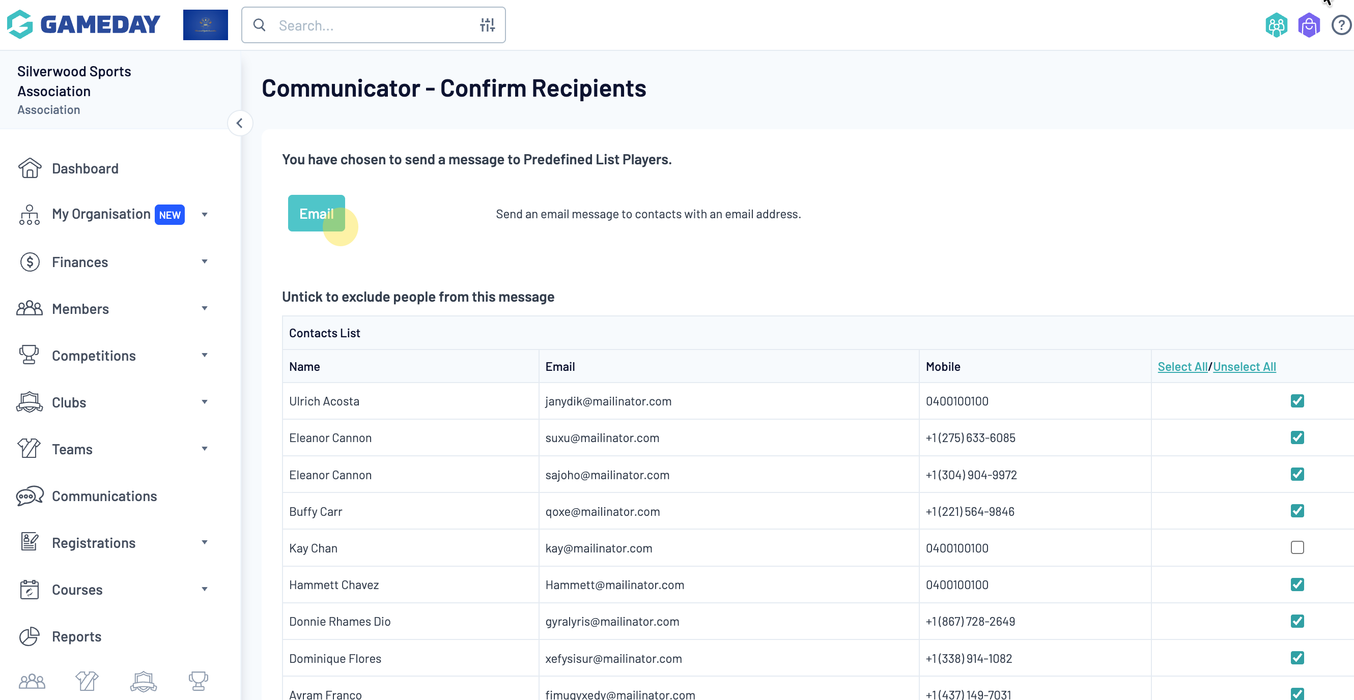 The 'Confirm Recipients' screen will appear. All members in the chosen group are selected by default, but you can untick the box next to a recipient's name to exclude them from the message