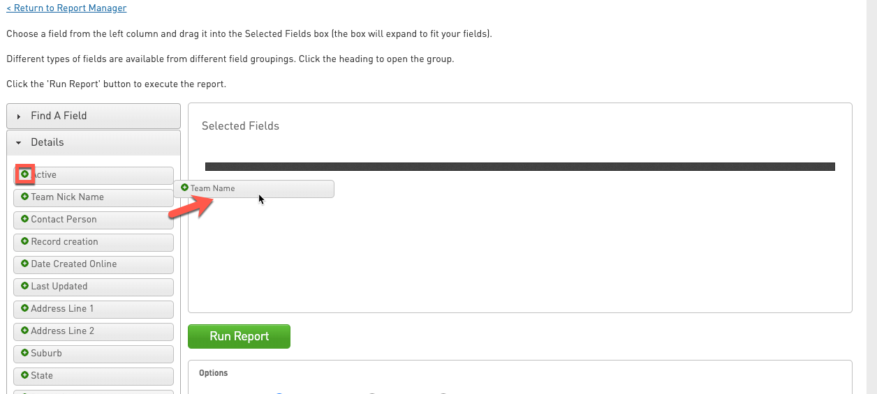 - Field List: A complete list of fields available to add to this report. Click the + button to add a field to the report.