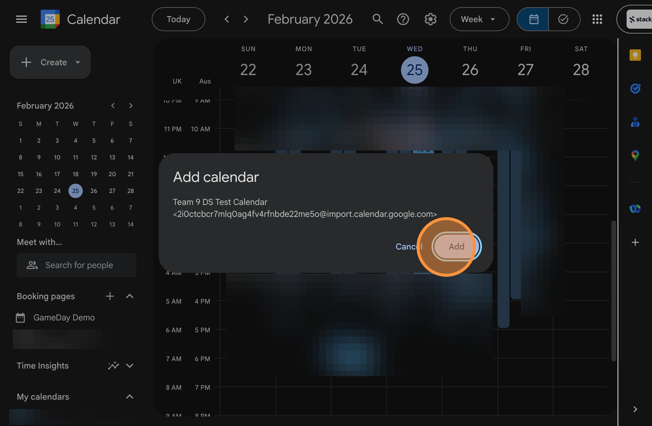 A prompt will appear to confirm that you would like to add this team to your calendar. Click "Add" to confirm this selection
